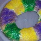 Retire o bolo do forno e deixe esfriar por cerca de 10 minutos sobre uma grelha metálica. Enquanto o bolo ainda morno, a colher o glacê no pão, permitindo que gotas de vidrado para driblar as laterais do bolo.Imediatamente polvilhe o pão com faixas alternadas de roxo, verde, amarelo e açúcar colorido. Permitir que o pão esfriar completamente antes de servir.